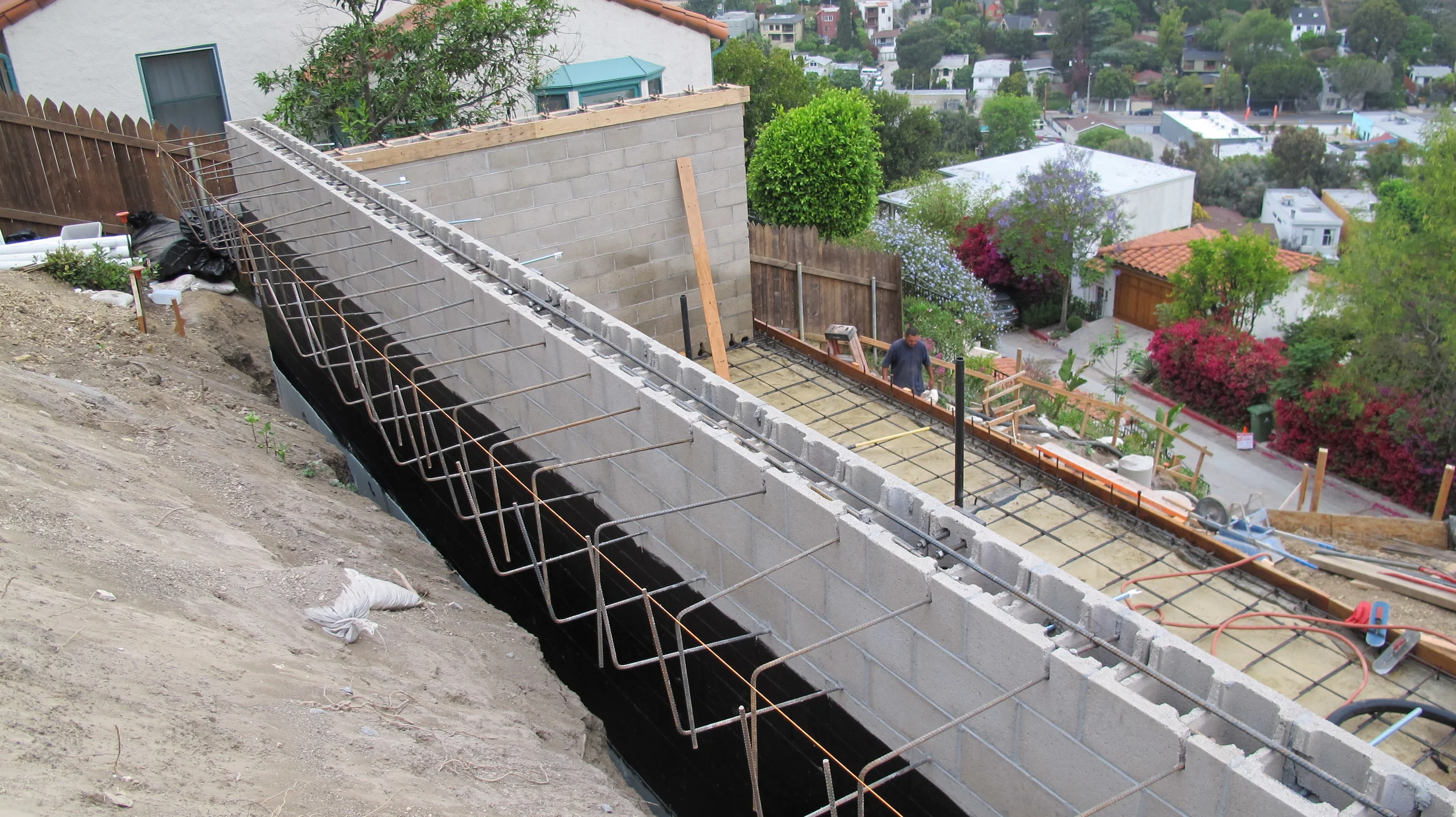 Construction site on a hillside with a partially built wall reinforced with steel rebar, and a worker standing nearby, with a residential neighborhood and colorful flowering trees in the background.