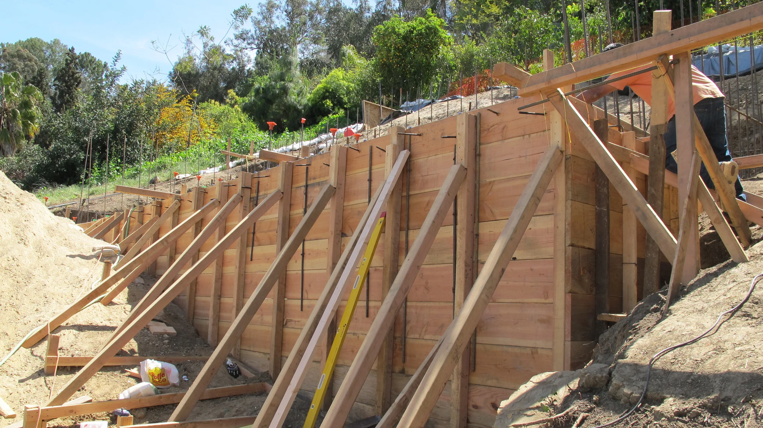 Construction workers pouring concrete on a sloped building foundation, with rebar and pipes in place, on a hillside residential area.