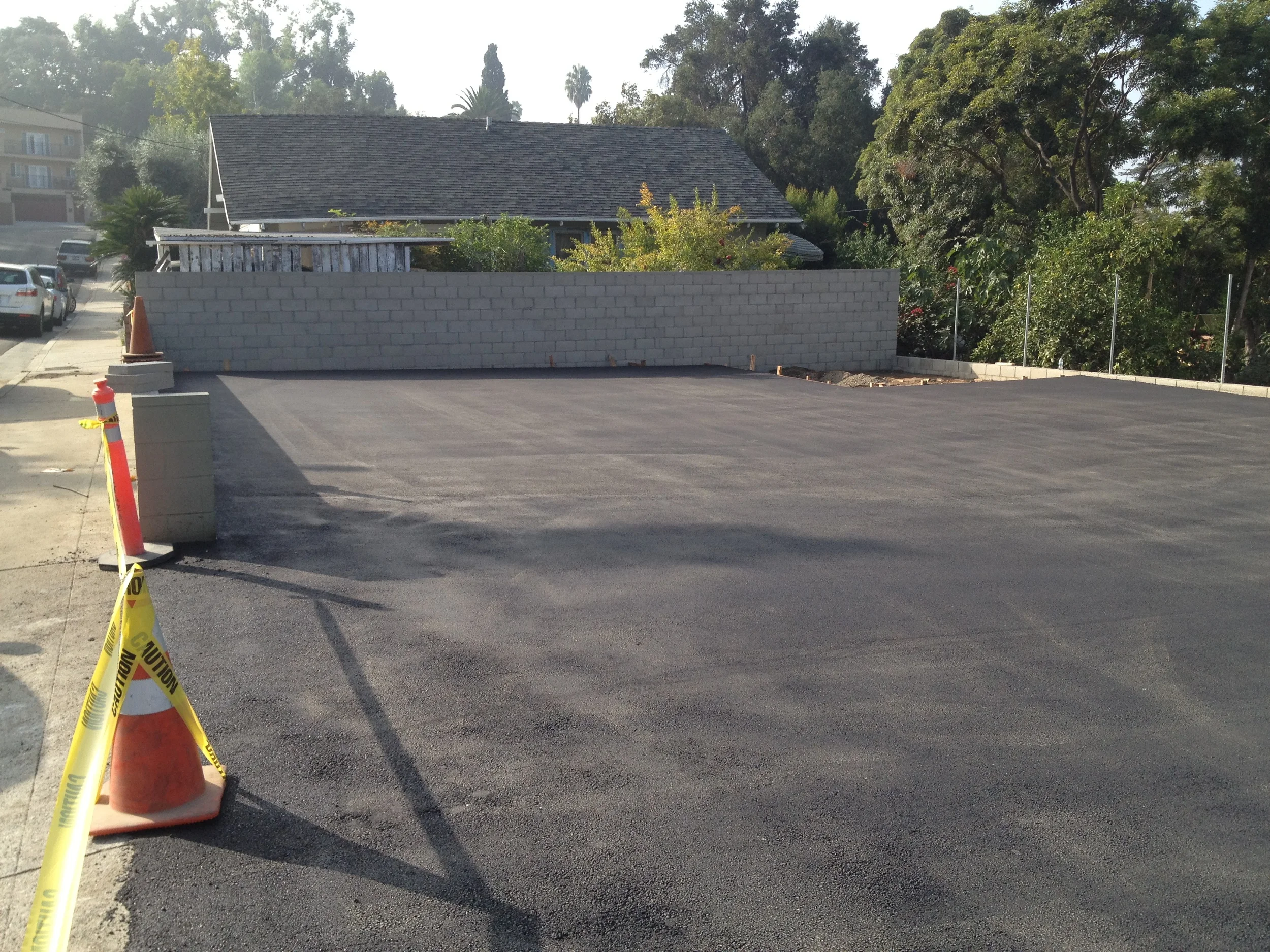 The finished wall and newly paved parking lot. That wall's over-engineered to stop stray cars from ploughing into the house next door.