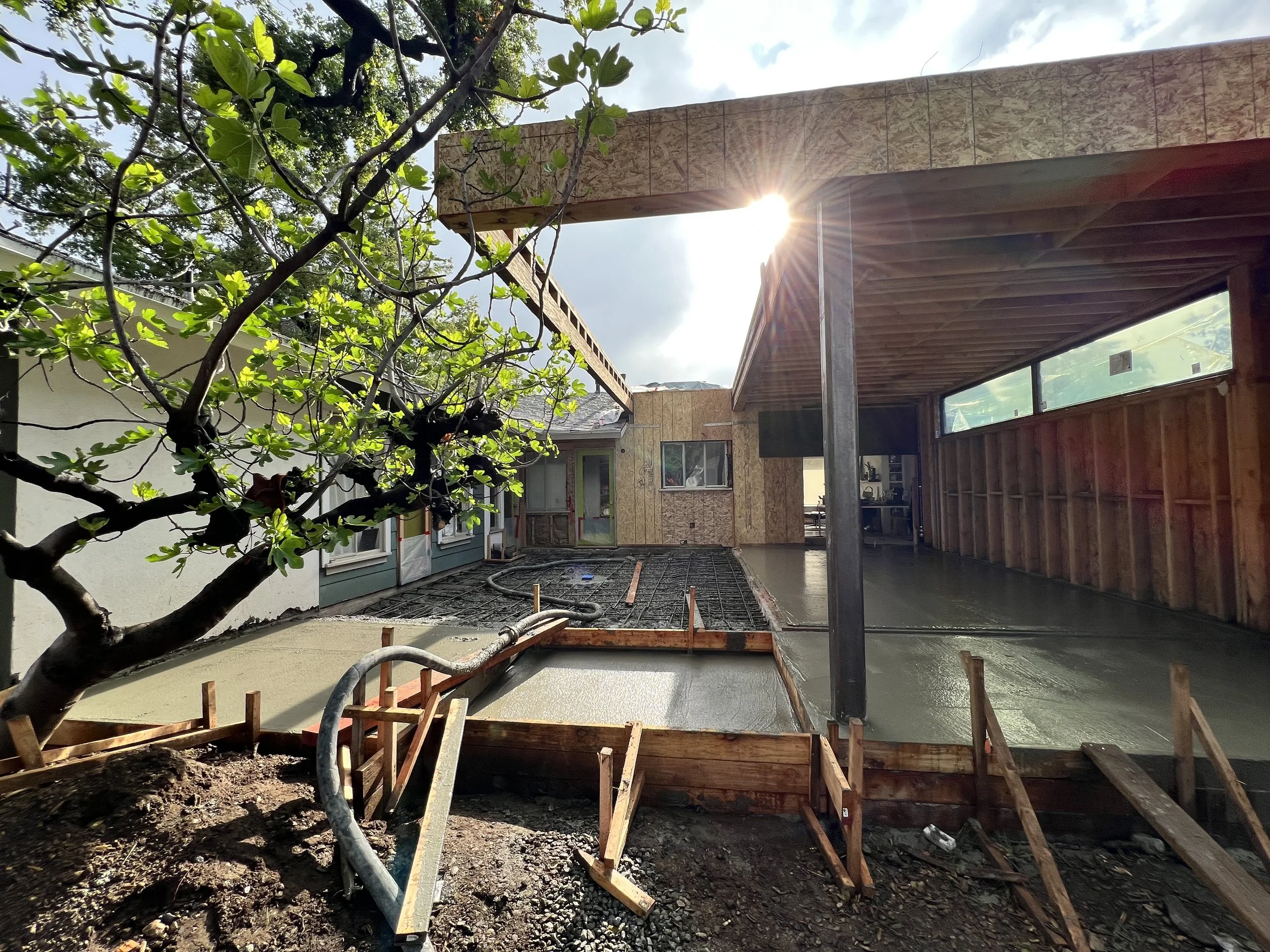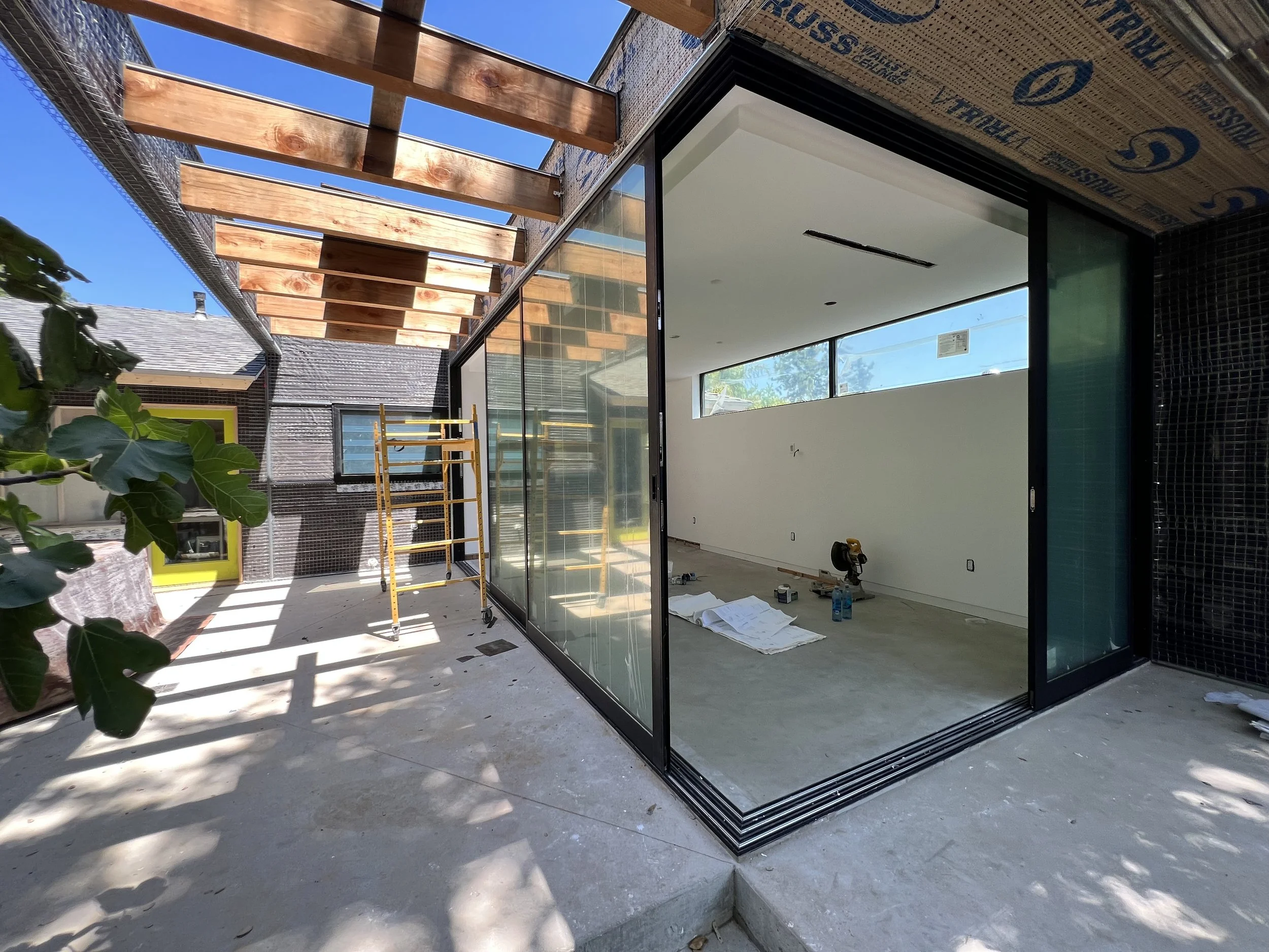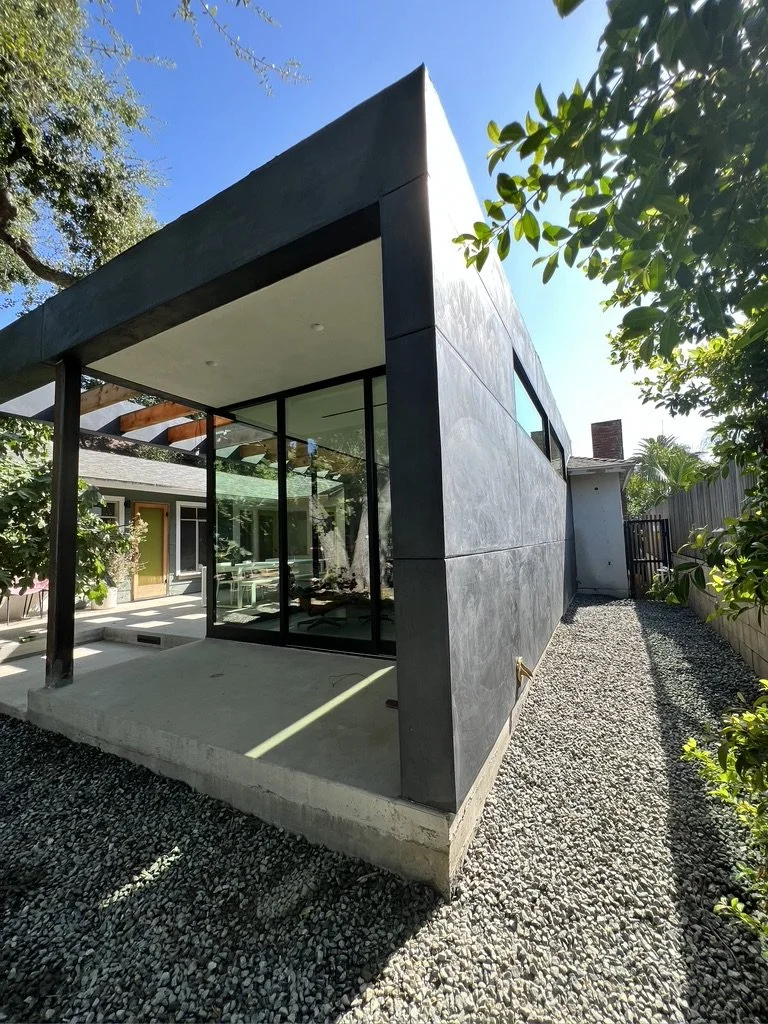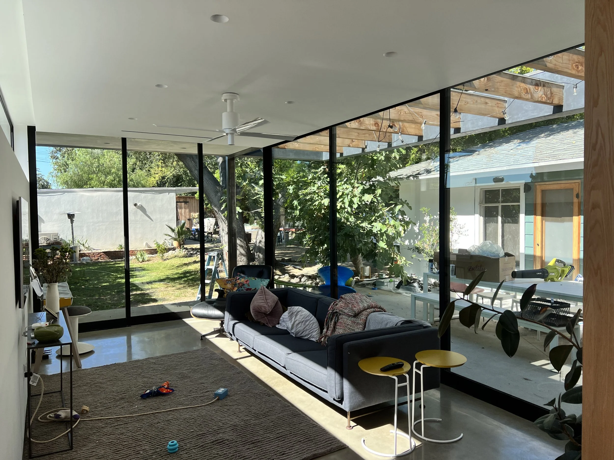 We added an ultramodern living room addition to this 1950s ranch home, creating an outdoor/indoor living option with the sliding glass doors meeting at the corner to provide a cozy room when cold out, but a two sided opened room to enjoy the Altadena spring/summer and fall days.