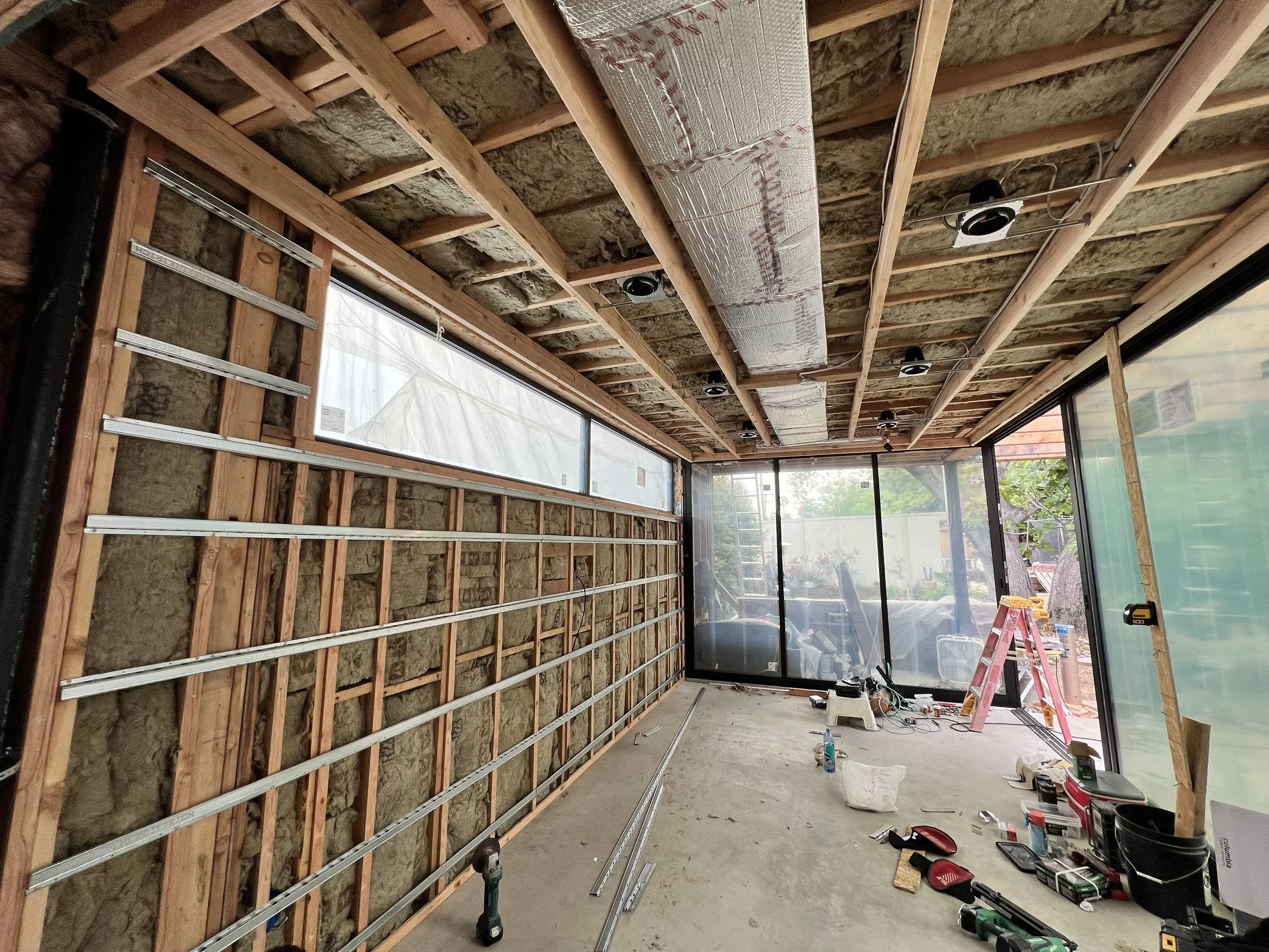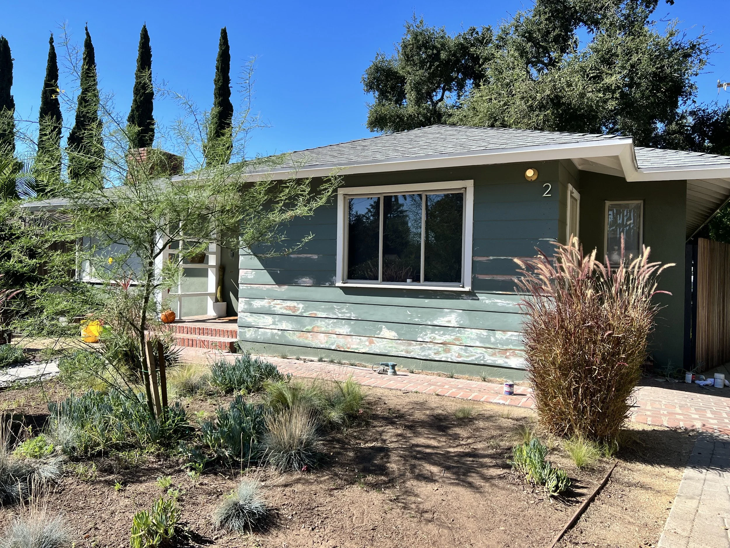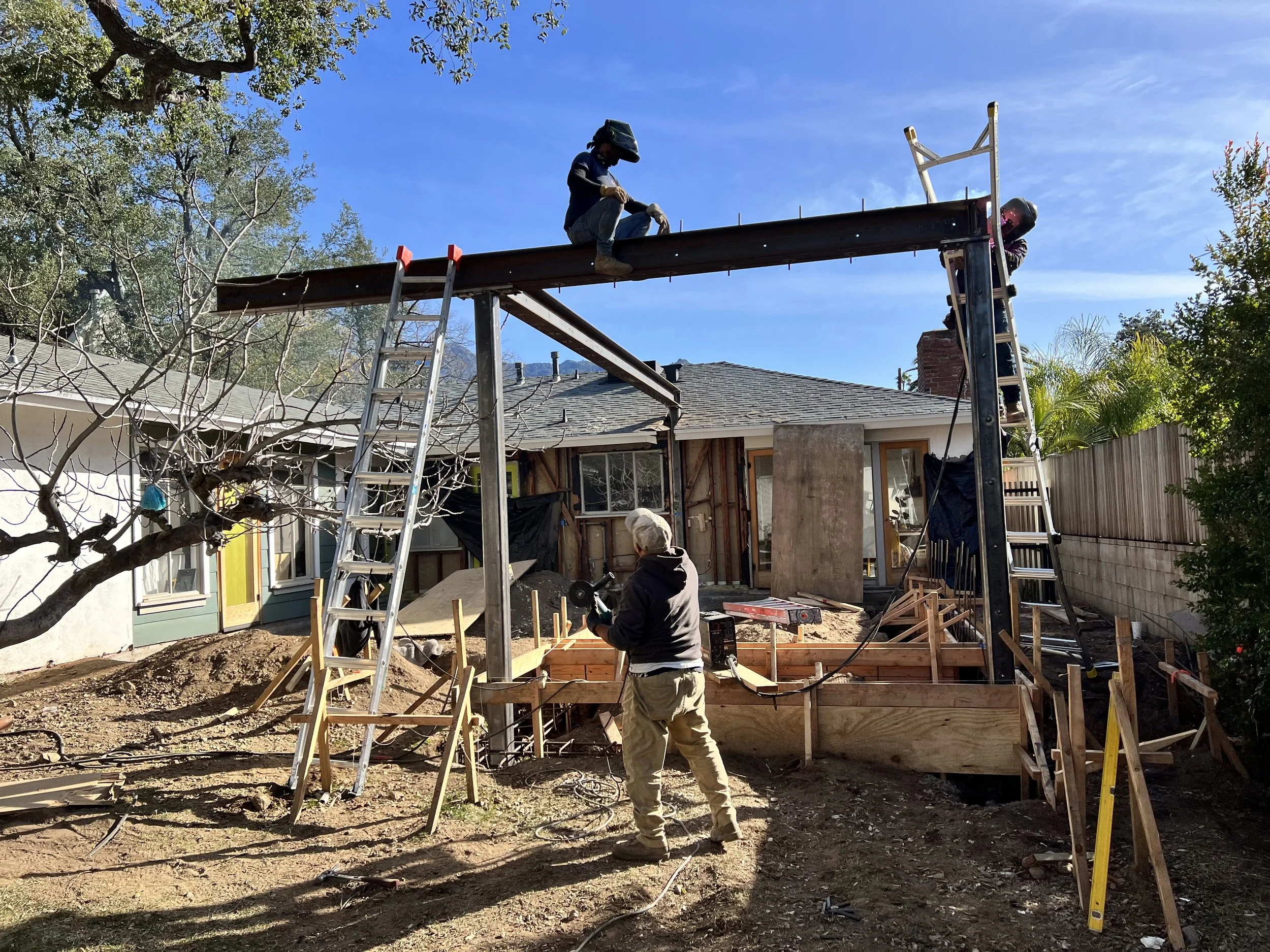 We added an ultramodern living room addition to this 1950s ranch home, creating an outdoor/indoor living option with the sliding glass doors meeting at the corner to provide a cozy room when cold out, but a two sided opened room to enjoy the Altadena spring/summer and fall days.