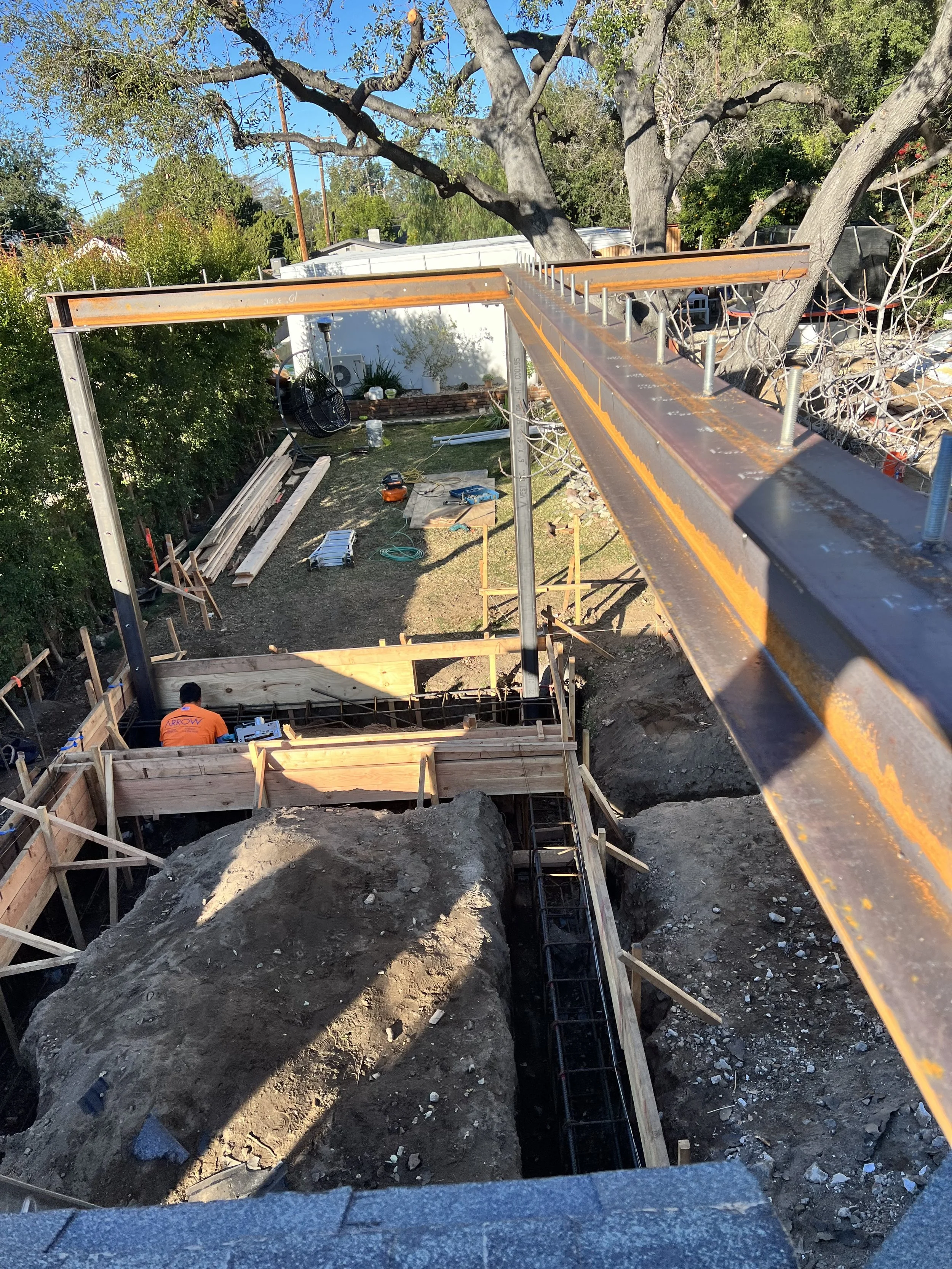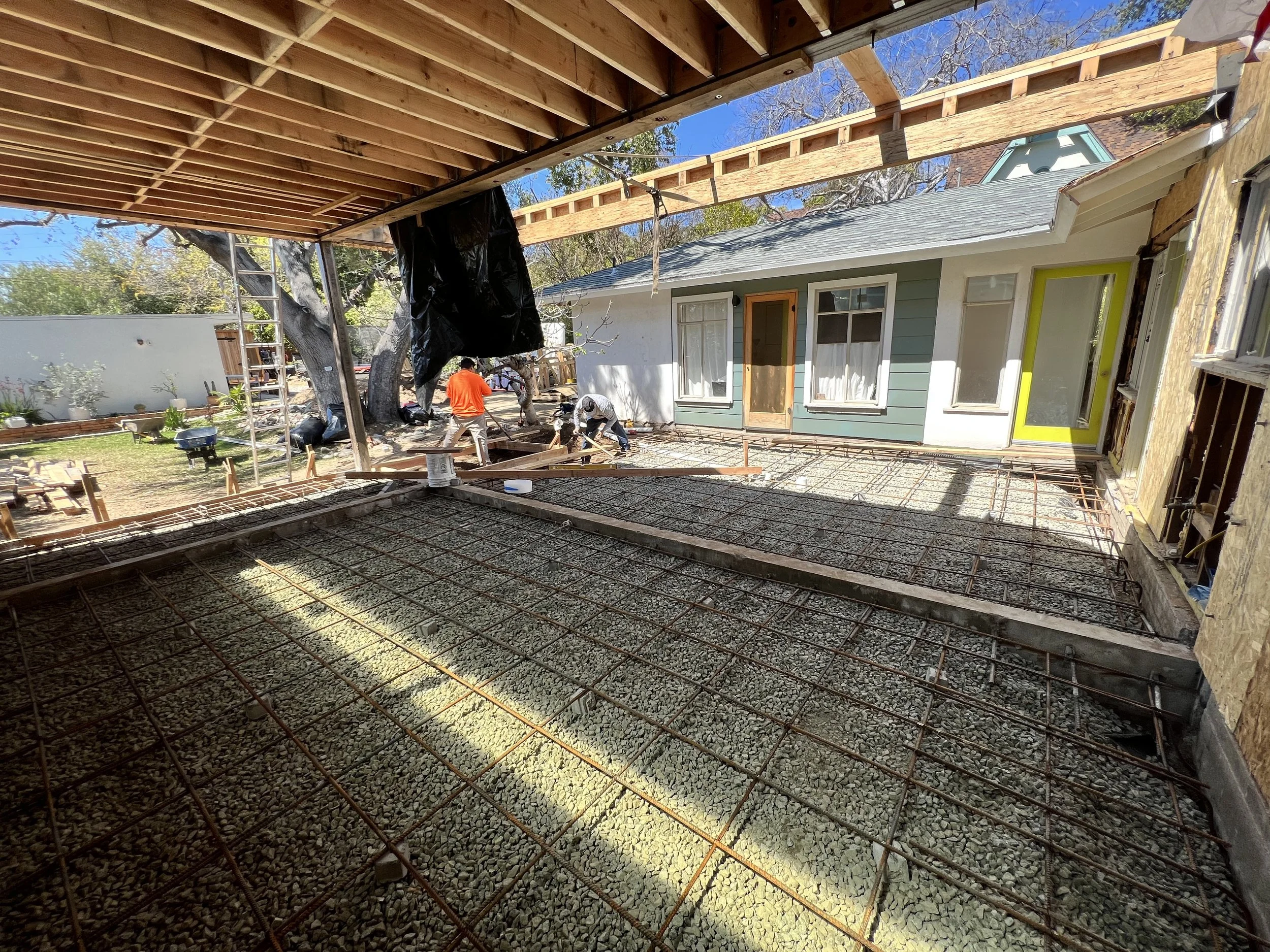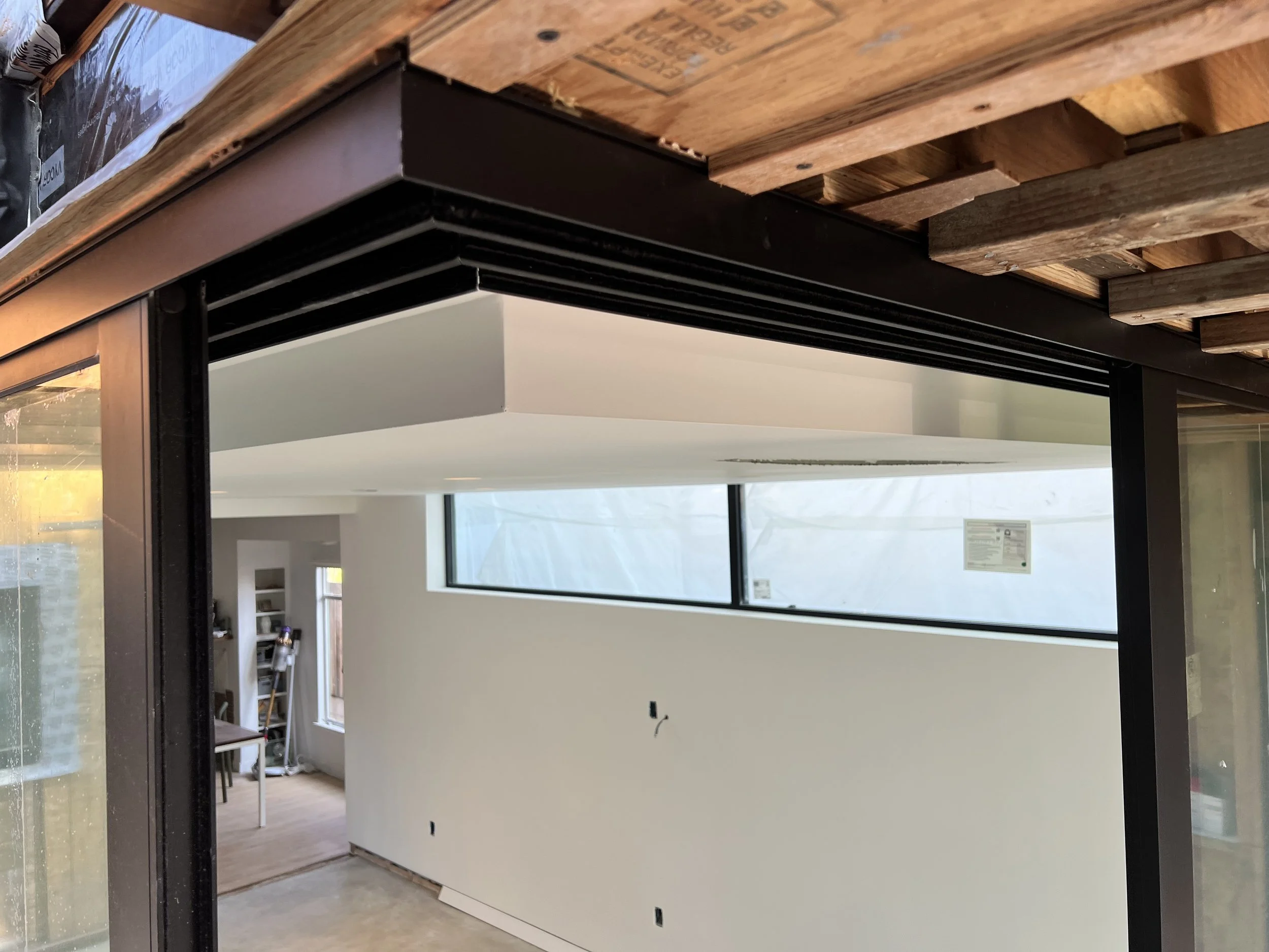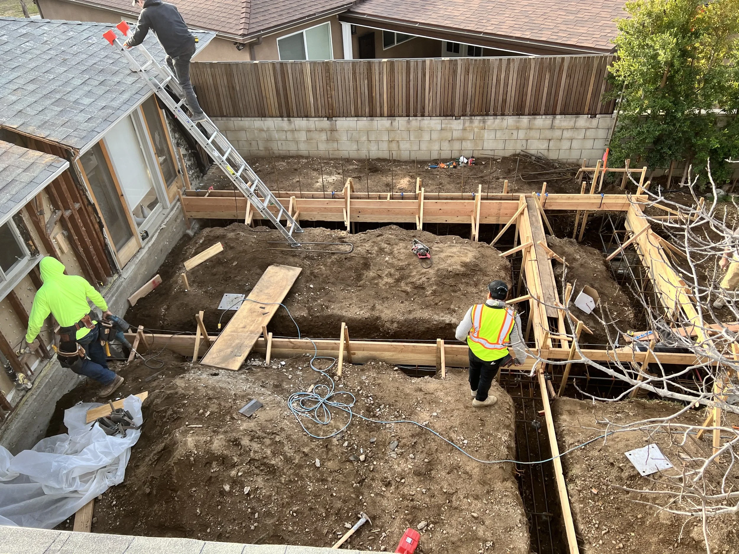 We added an ultramodern living room addition to this 1950s ranch home, creating an outdoor/indoor living option with the sliding glass doors meeting at the corner to provide a cozy room when cold out, but a two sided opened room to enjoy the Altadena spring/summer and fall days.