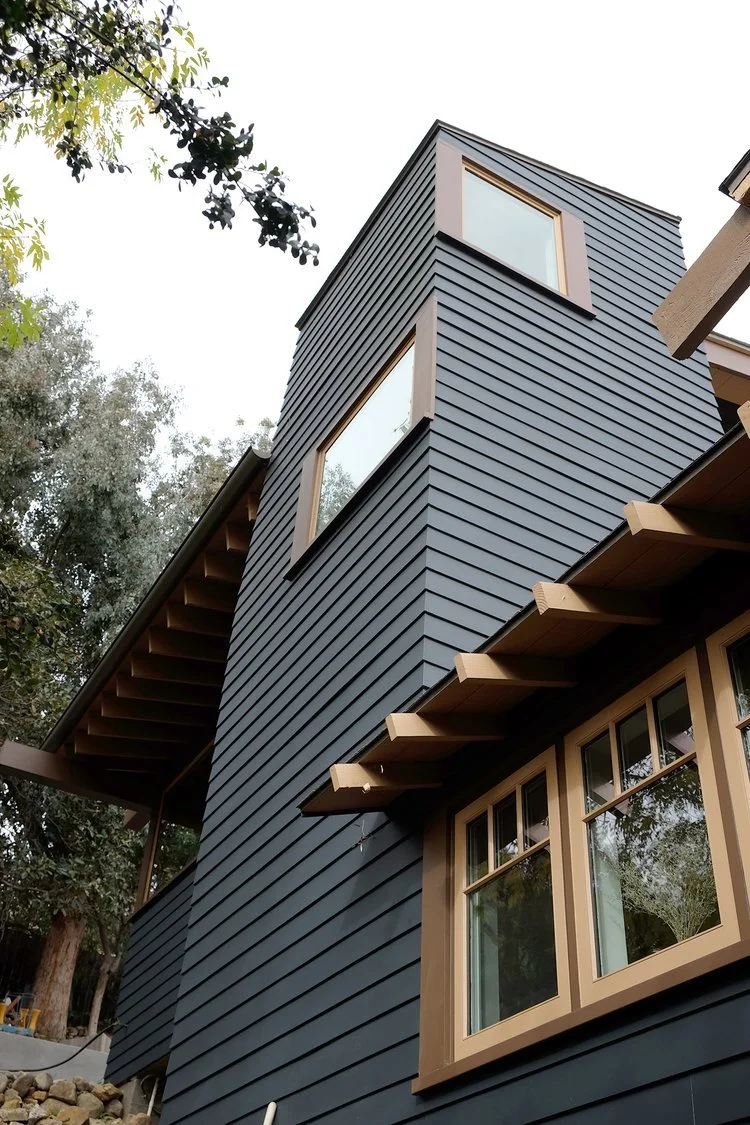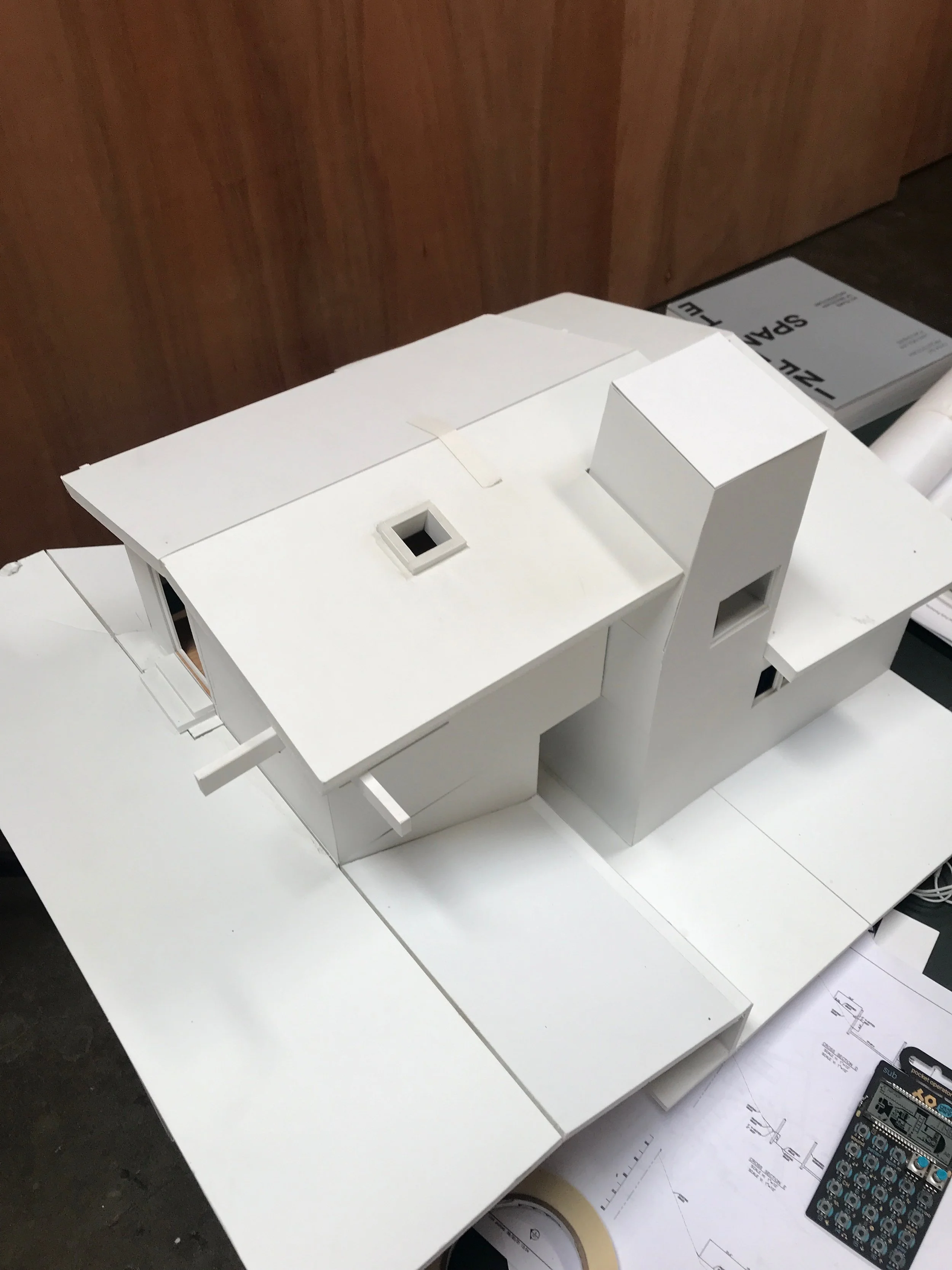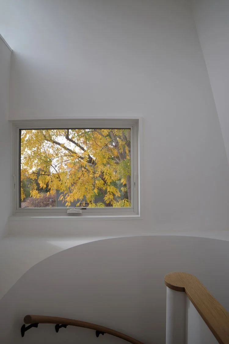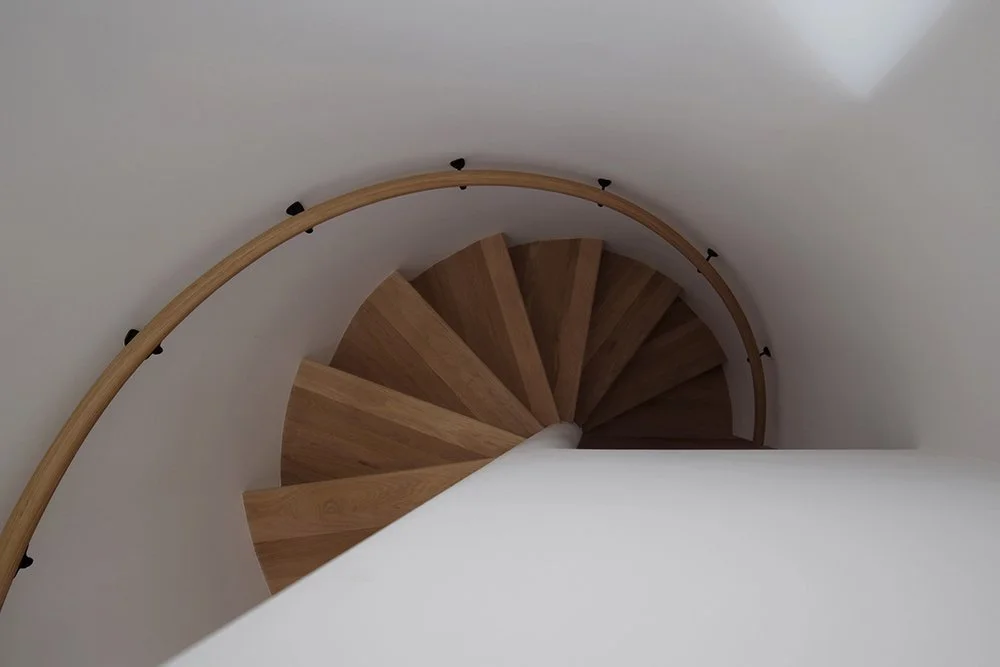 A bedroom bathroom addition floats on a bridge behind the existing house and is connected via a spiral staircase that descends through a tower.