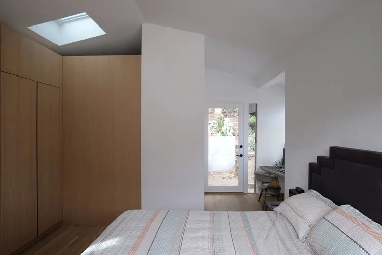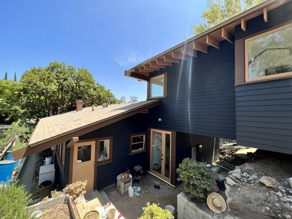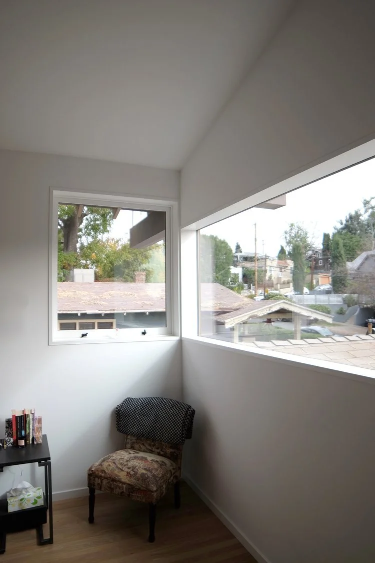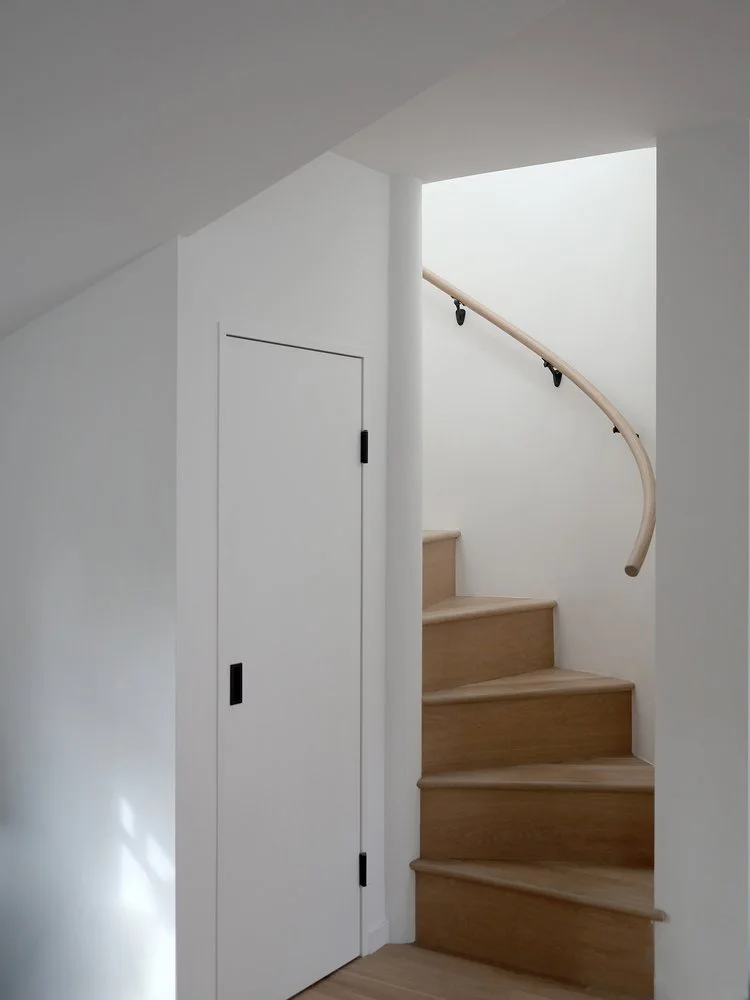 A bedroom bathroom addition floats on a bridge behind the existing house and is connected via a spiral staircase that descends through a tower.